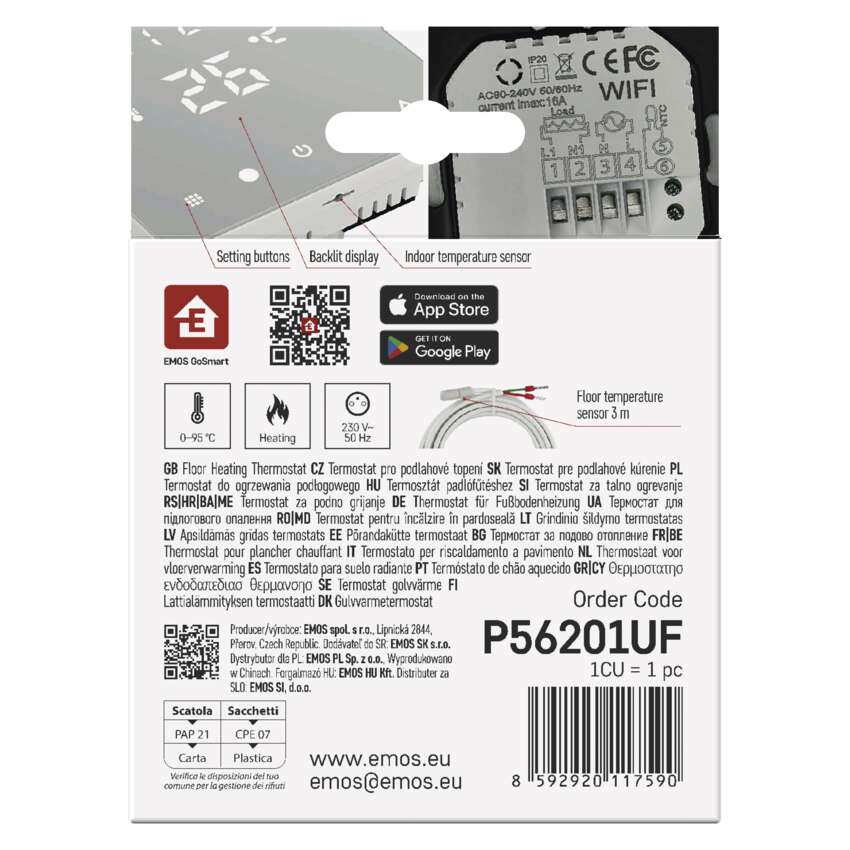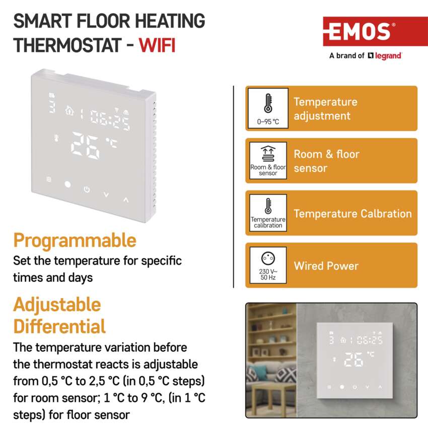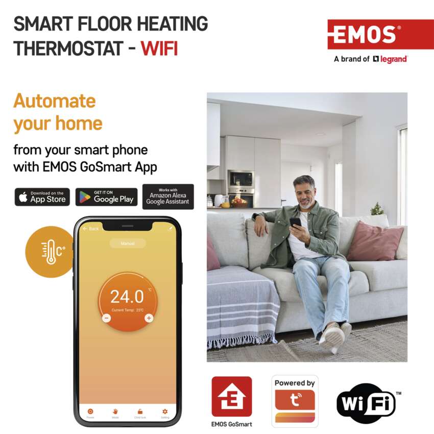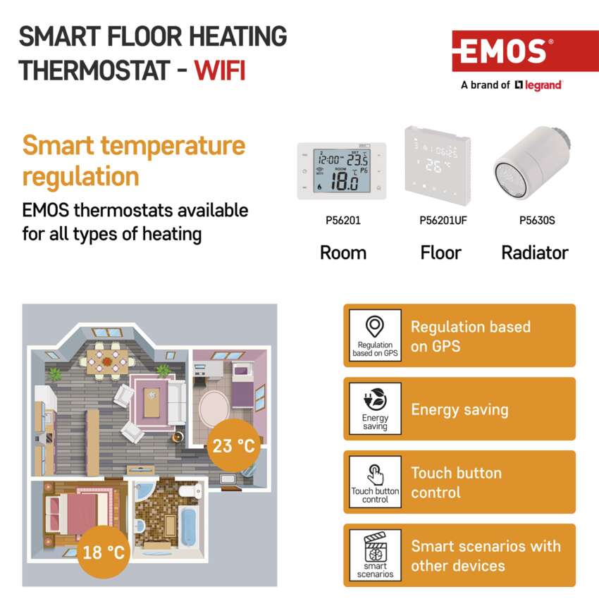 With the P56201UF smart thermostat from the EMOS GoSmart range, designed especially for underfloor heating, it’s easy. Controlling your heating based on your GPS location, setting heat scenarios for specific days and times and controlling all settings from anywhere using the app are just a short list of the advanced features this thermostat has.