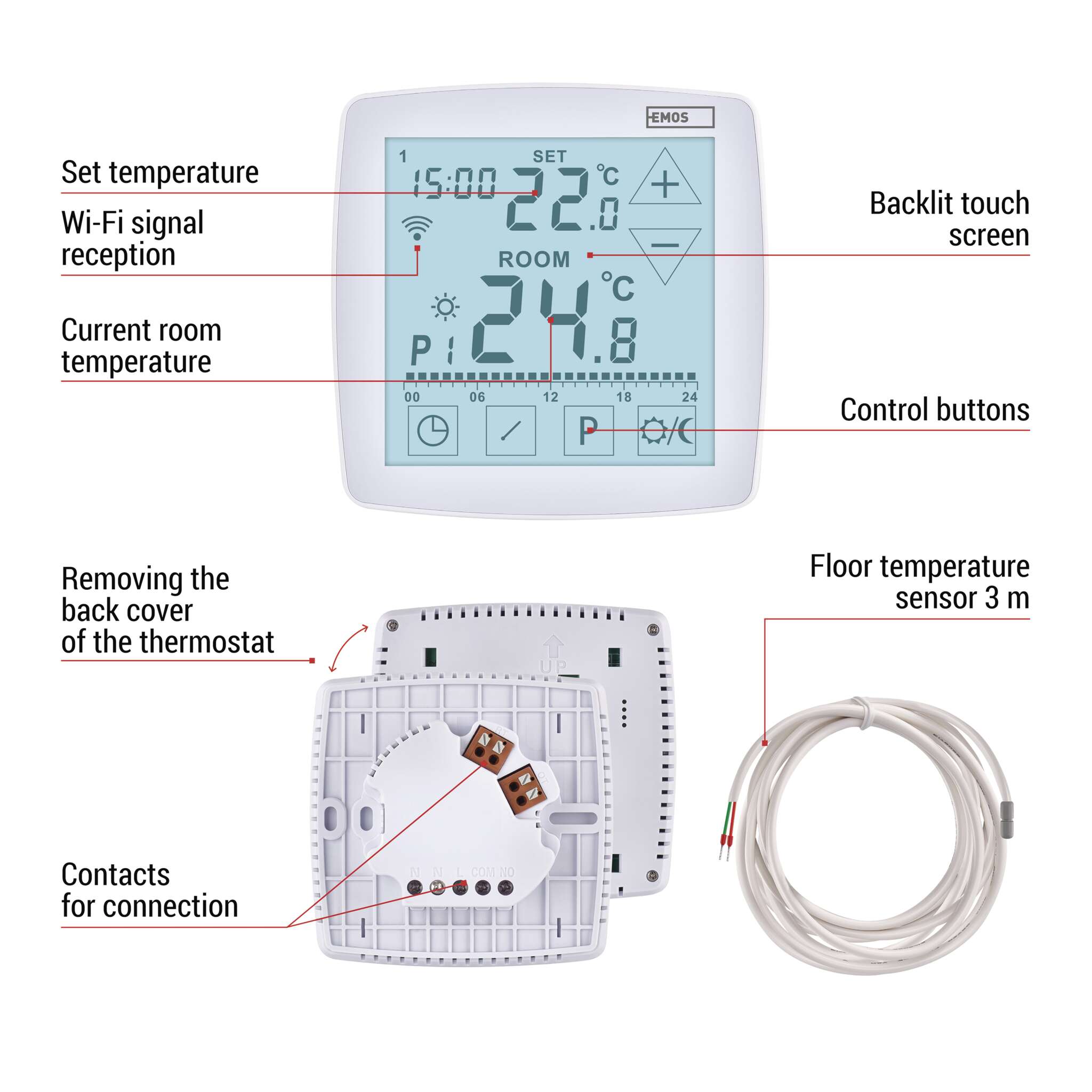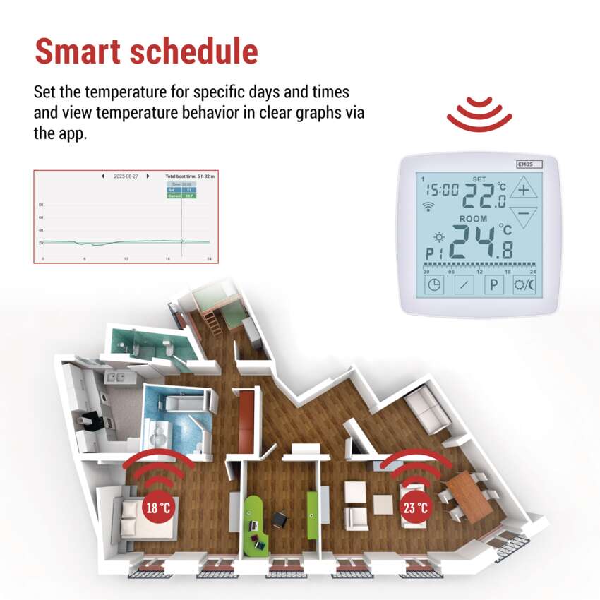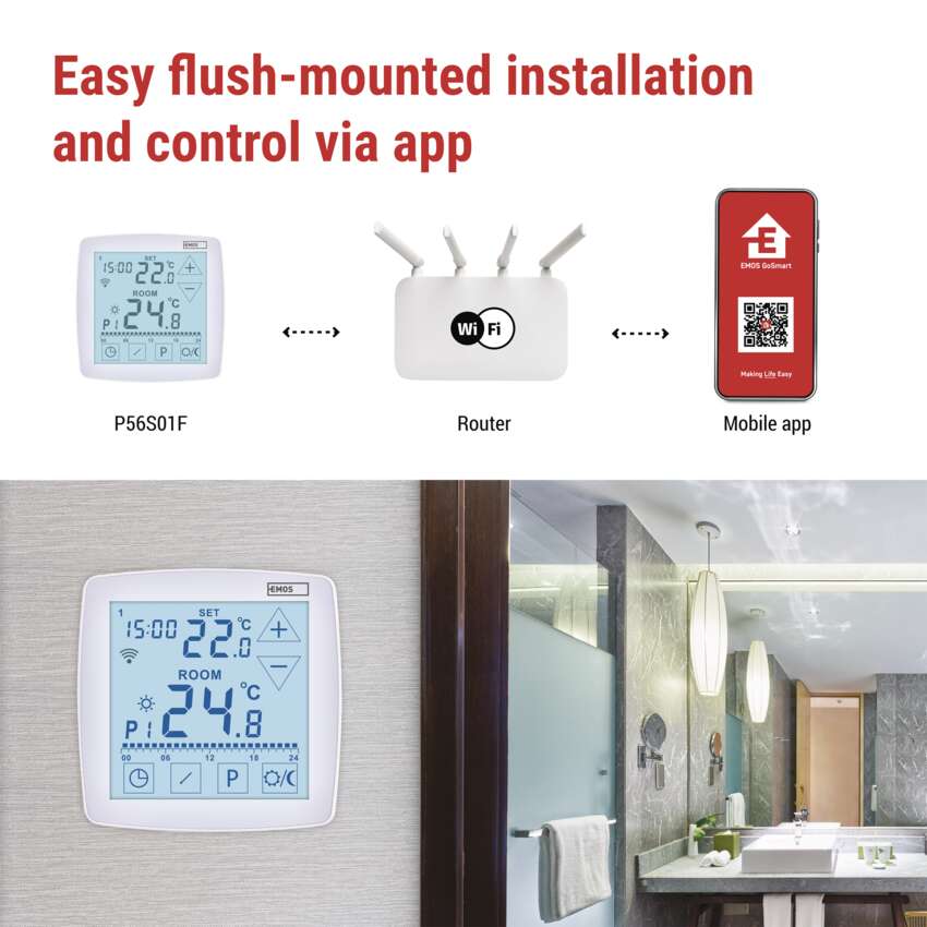 The smart floor thermostat P56S01F from the EMOS GoSmart series will help you maintain the ideal temperature, save energy and enjoy maximum comfort at the same time. Thanks to the advanced OpenTherm technology, it automatically optimises heating and cooling according to current conditions, ensuring efficient operation without unnecessary losses. Add to this clever features – GPS location control, temperature scenario planning, control via app from anywhere and support for Google Assistant and Amazon Alexa – and you have a truly invaluable helper in your home. The modern design, created exclusively for EMOS, makes the thermostat not only practical but also a stylish addition to any interior.