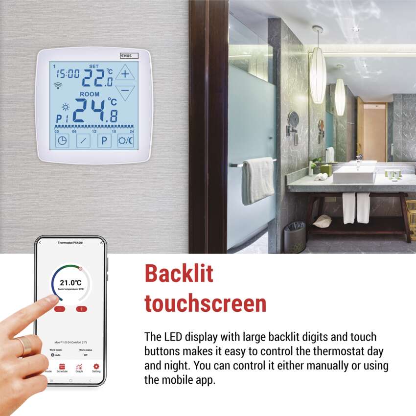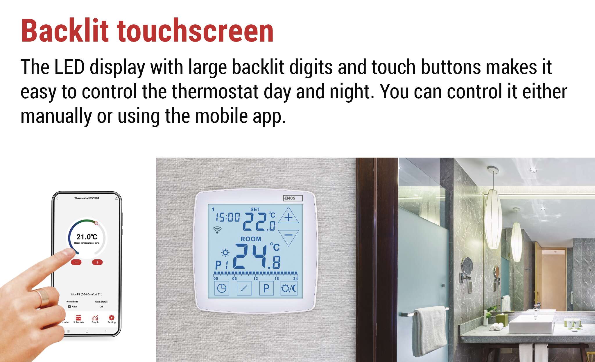 The P56S01F thermostat combines practical functionality with a modern, timeless design that fits any interior. The backlit touchscreen display is clear and intuitive – the large digits make it easy to see the current and set temperature, and the backlight makes it comfortable to operate even at night without having to turn on the light. Plus, the thermostat supports Amazon Alexa and Google Assistant so you can control it with voice commands.