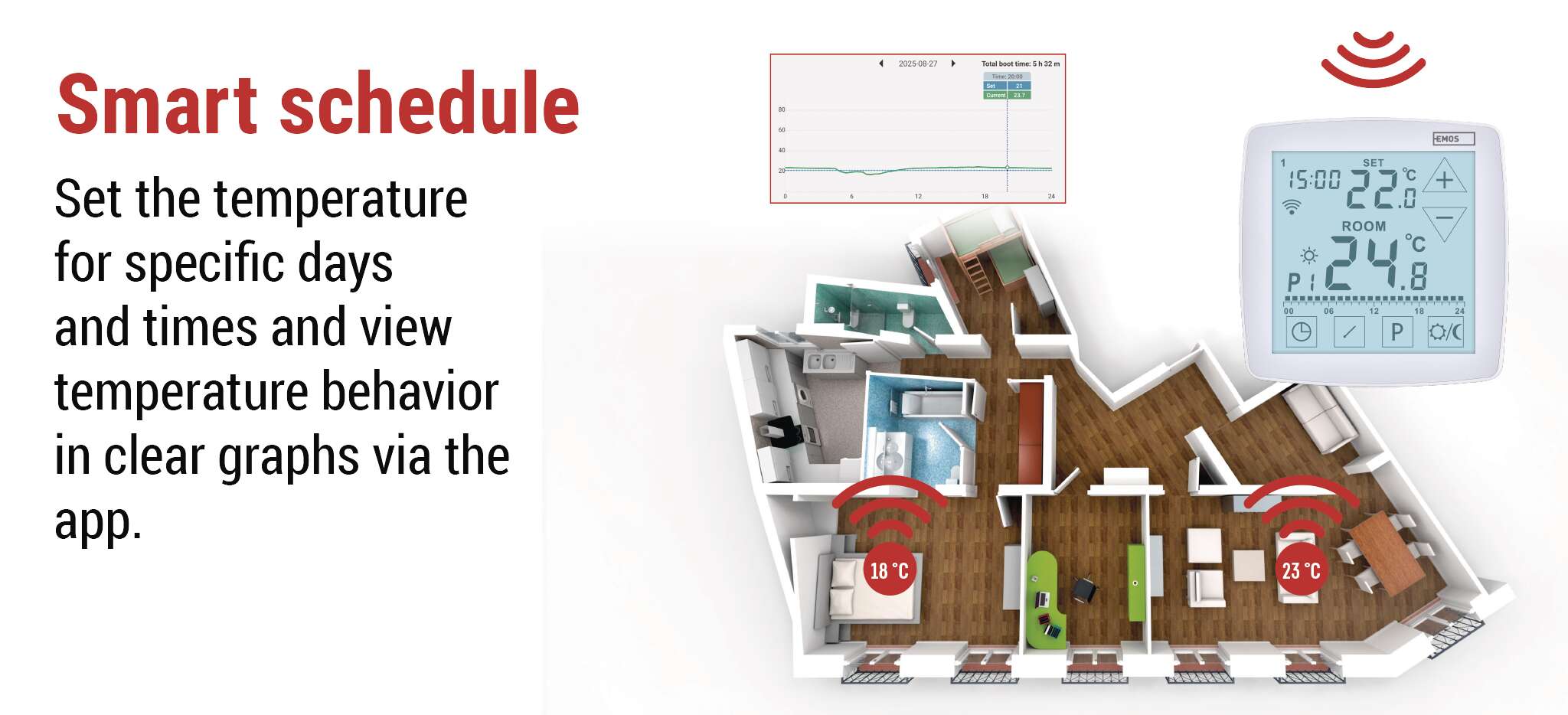 Thanks to the clever GPS function, the thermostat automatically turns on heating or cooling so that you are always greeted by the ideal temperature when you return. And if you go on holiday and forget to turn the heating down, no problem – you can adjust everything remotely at any time via the Mobile App EMOS GoSmart. Convenience, savings and security – wherever you are.