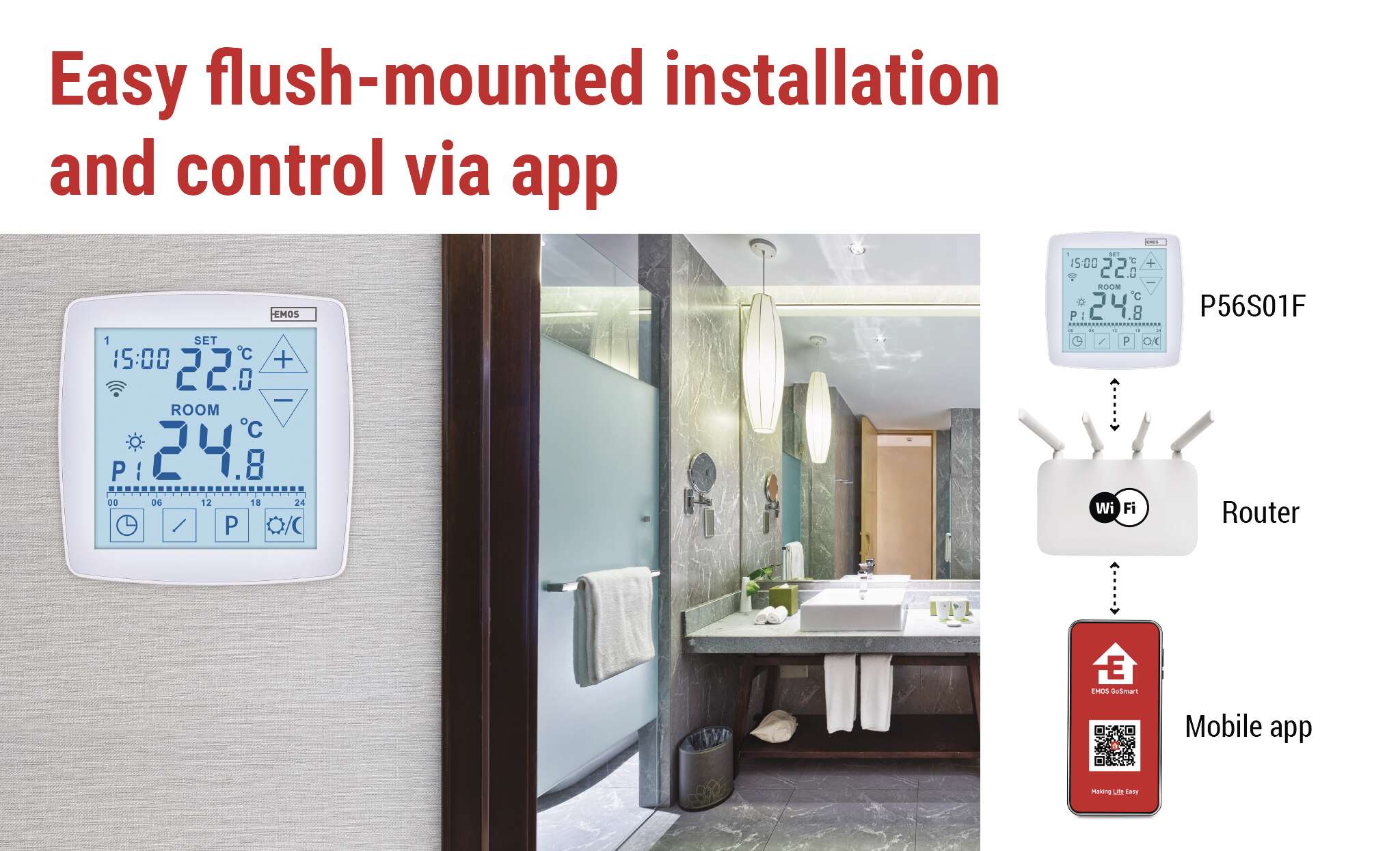 The smart thermostat P56S01F is equipped with a 3 meter long cable with temperature sensor, which thanks to its length can be conveniently placed in the floor to your underfloor heating. You then screw the thermostat installation pad into the appropriate mounting box, connect the wires and temperature sensor cable according to the wiring diagram and finally attach the front cover. And you’re done! The P56S01 smart thermostat is powered from a 230 V AC mains power supply.
