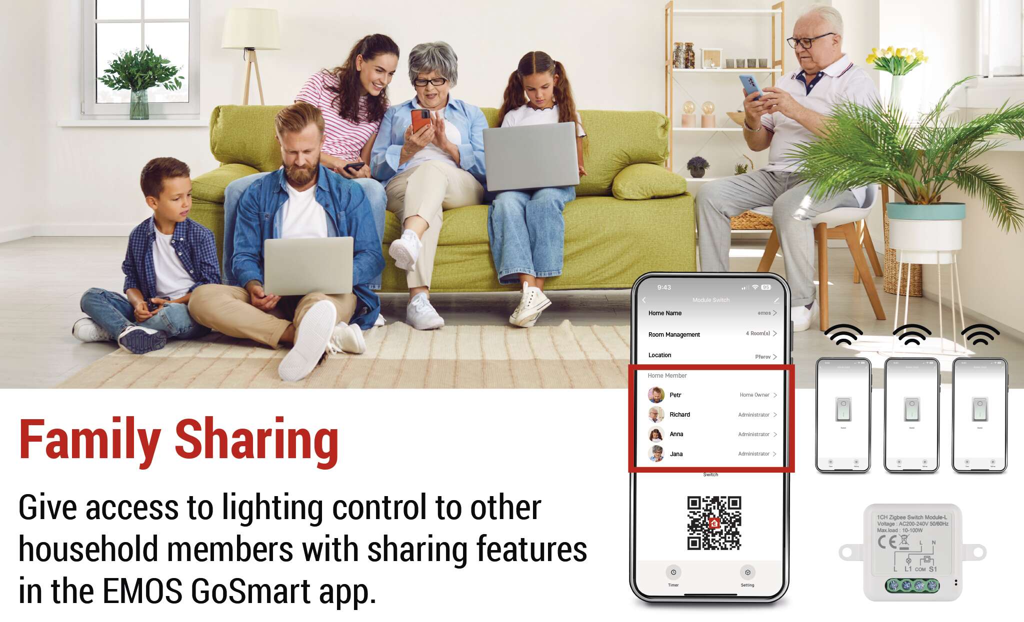The smart module can be connected to other devices in your home (clocks, lights, door, window, heating sensors). After pairing with the EMOS GoSmart mobile app, you can automate and schedule times for individual appliances. For example, automatically switch on the lights during your holiday. Create a smart home that adapts to your needs.