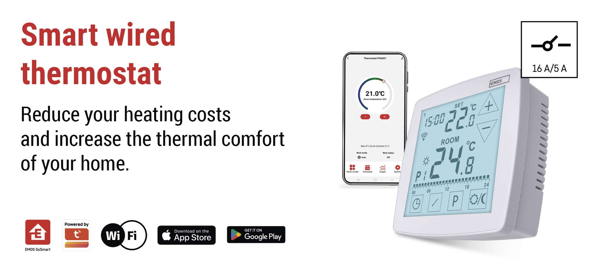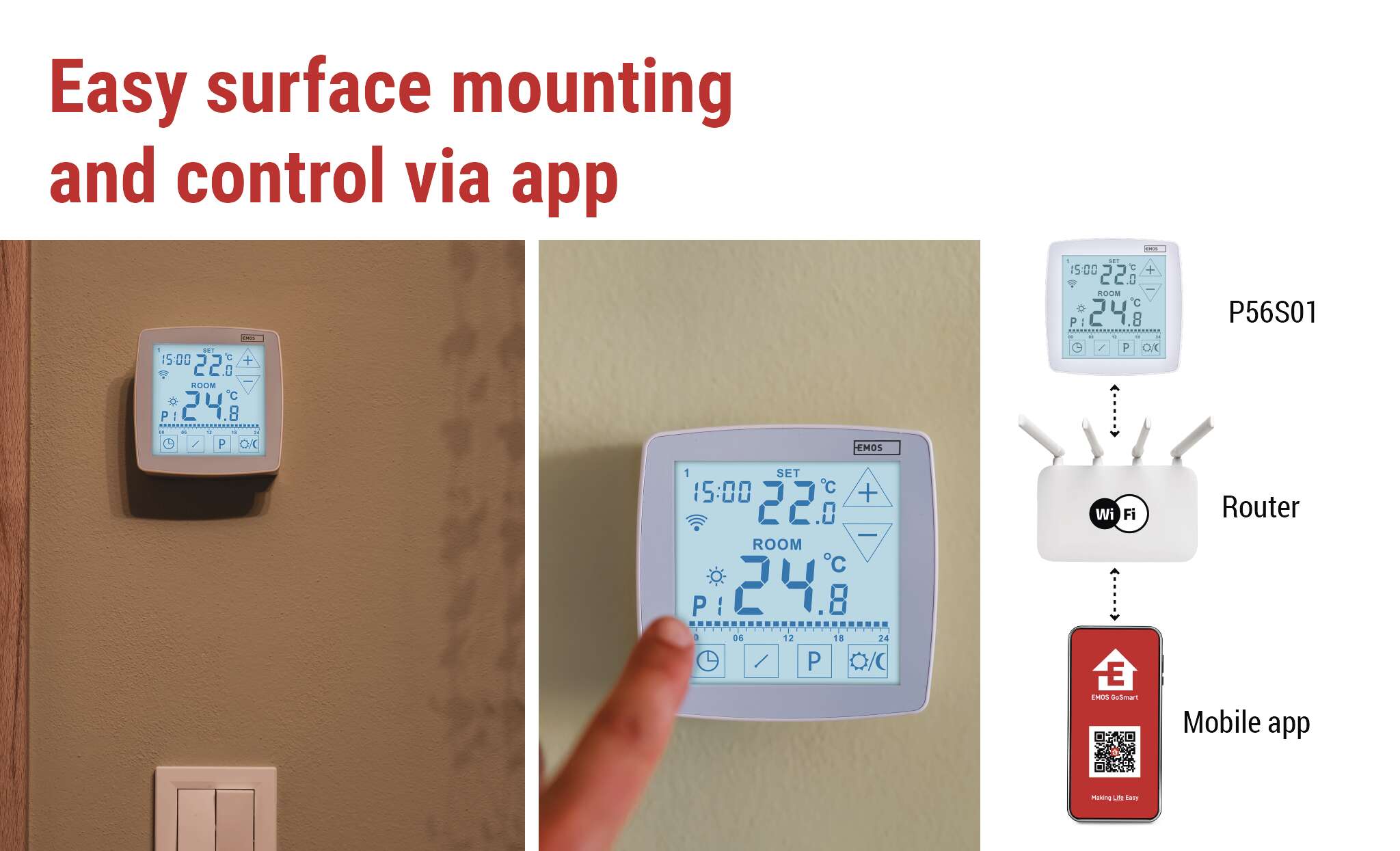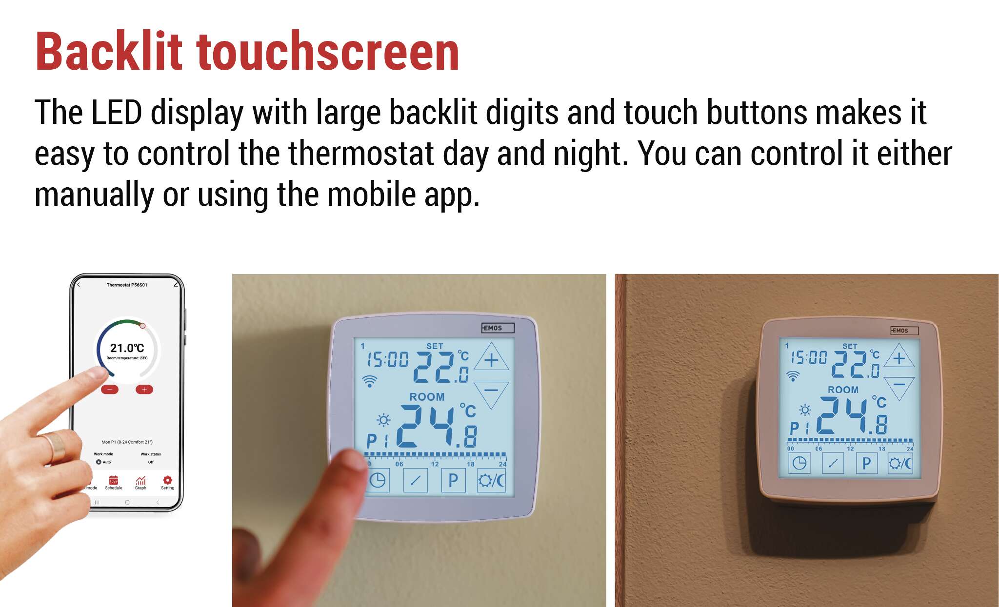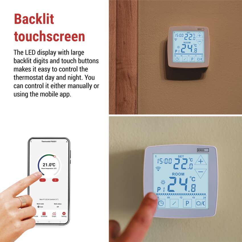 The P56S01 thermostat combines practical functionality with a modern, timeless design that fits into any interior.The backlit touchscreen is clear and intuitive – the large digits make it easy to see the current and set temperature, and the backlight makes it comfortable to operate even at night without turning on the light. Plus, the thermostat supports Amazon Alexa and Google Assistant so you can control it with voice commands.