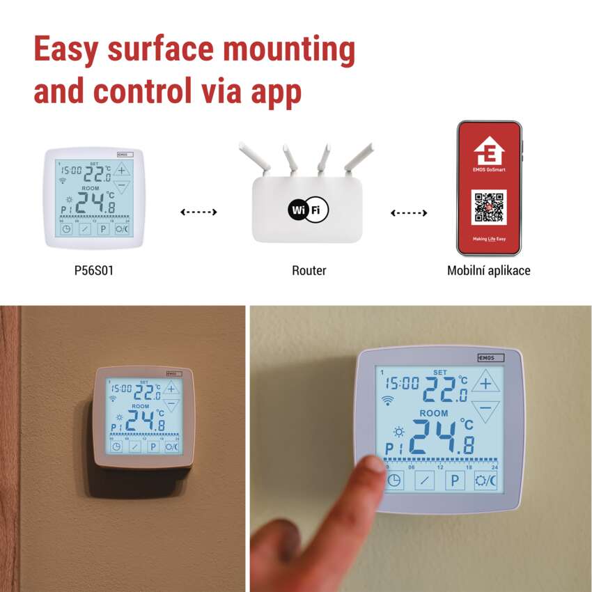 The smart Wireless Thermostat with Floor Sensor P56S01 from the EMOS GoSmart range helps you maintain the ideal temperature, save energy and enjoy maximum comfort at the same time. Thanks to advanced OpenTherm technology, it automatically optimises heating and cooling according to current conditions, ensuring efficient operation without unnecessary losses. Add to that smart features – GPS location control, temperature scenario planning, app control from anywhere and support for Google Assistant and Amazon Alexa – and you have a truly intelligent climate control centre for your home. The modern design, created exclusively for EMOS, makes the thermostat not only practical but also a stylish addition to any interior.