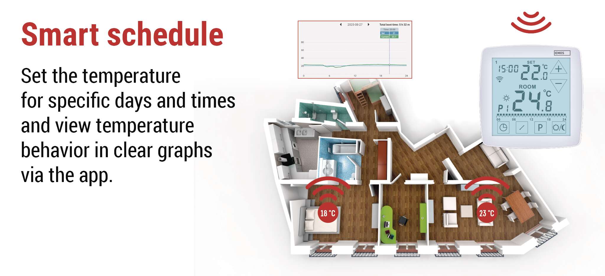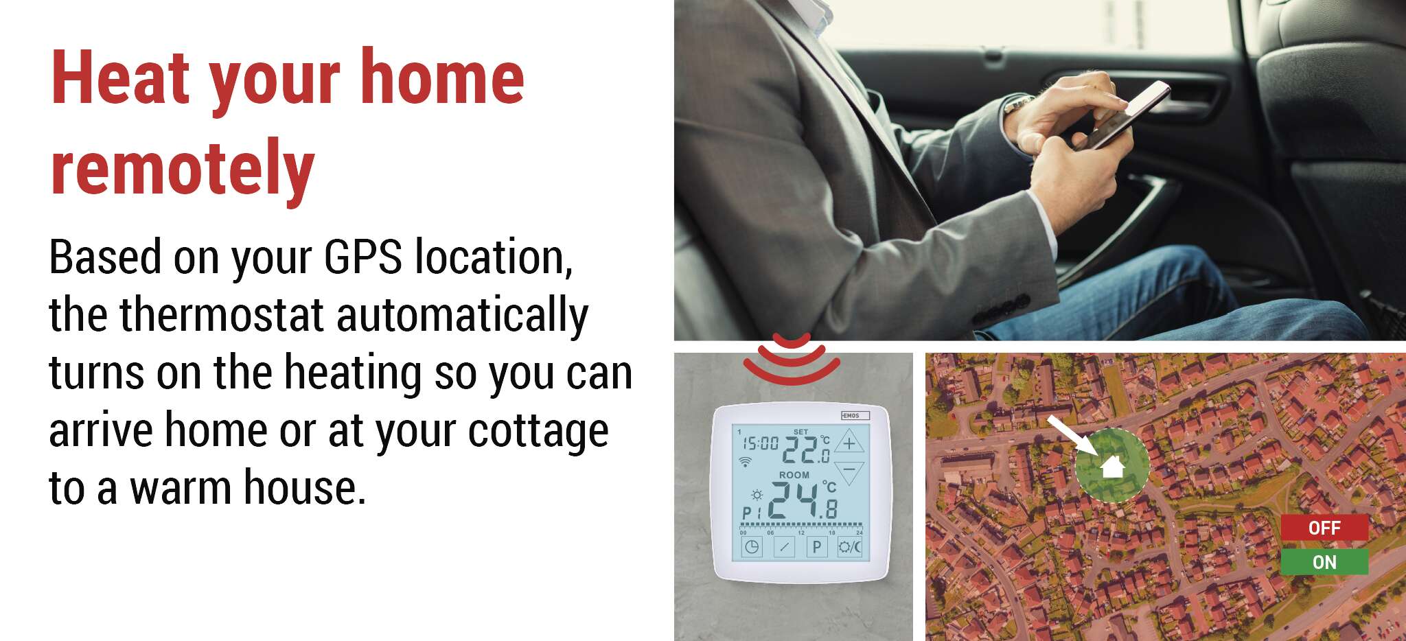Thanks to the clever GPS function, the thermostat automatically turns on heating or cooling so that you are always greeted by the ideal temperature when you return. And if you go on holiday and forget to turn the heating down, no problem – you can adjust everything remotely at any time via the Mobile EMOS GoSmart App. Convenience, savings and security – wherever you are.
