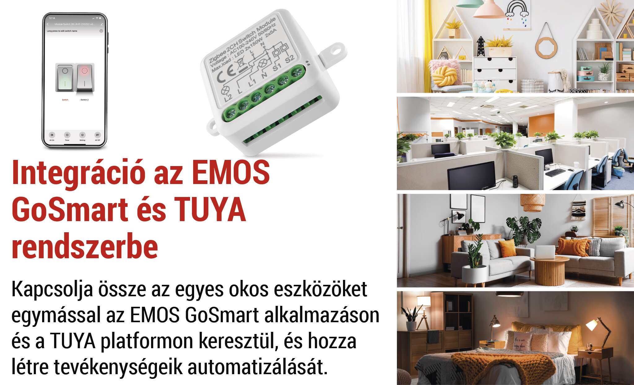 Az okos modul kapcsolható az otthonában található más eszközökhöz (órák, lámpák, ajtó-, ablak-, fűtésérzékelők). Az EMOS GoSmart mobilalkalmazással való párosítás után automatizálhatja és ütemezheti az egyes készülékek idejét. Például automatikusan bekapcsolhatja a világítást, amikor Ön szabadságon van. Hozzon létre egy okos otthont, amely alkalmazkodik az Ön igényeihez.