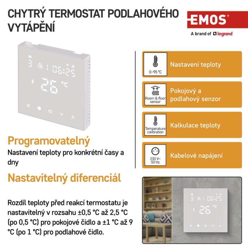 S chytrým termostatem P56201UF z řady EMOS GoSmart, určeným zejména pro podlahová topení, je to snadné. Regulace topení na základě vaší GPS polohy, nastavení teplotních scénářů pro konkrétní den i čas a ovládání všech nastavení odkudkoliv pomocí aplikace, to je jen krátký výčet pokročilých funkcí, kterými tento termostat disponuje.