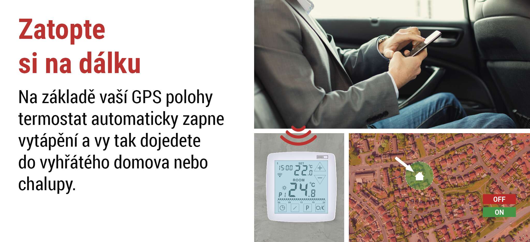 Díky chytré GPS funkci termostat automaticky zapne vytápění nebo chlazení tak, aby vás po návratu vždy přivítala ideální teplota. A pokud odjíždíte na dovolenou a zapomenete snížit topení, žádný problém – přes mobilní aplikaci EMOS GoSmart můžete vše kdykoli upravit na dálku. Pohodlí, úspora a jistota – ať jste kdekoli.