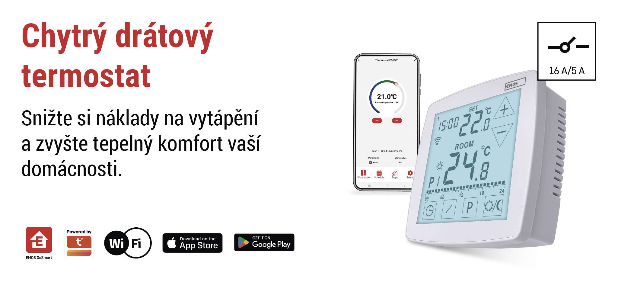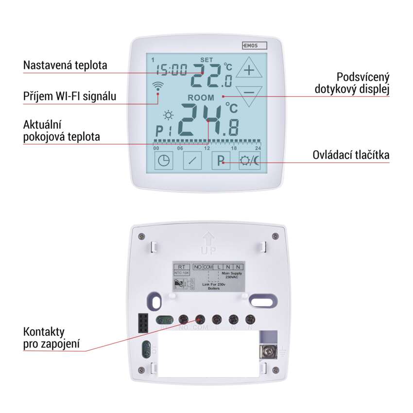 Chytrý drátový termostat s podlahovým čidlem P56S01 z řady EMOS GoSmart vám pomůže udržet ideální teplotu, šetřit energii a zároveň si užívat maximální komfort. Díky pokročilé technologii OpenTherm automaticky optimalizuje vytápění i chlazení podle aktuálních podmínek, čímž zajišťuje efektivní provoz bez zbytečných ztrát. Přidejte k tomu chytré funkce – regulaci podle GPS polohy, plánování teplotních scénářů, ovládání přes aplikaci odkudkoli a podporu hlasových asistentů Google Assistant a Amazon Alexa – a získáte skutečně inteligentní centrum pro řízení klimatu ve vaší domácnosti. Moderní design, vytvořený exkluzivně pro společnost EMOS, pak z termostatu dělá nejen praktický, ale i stylový doplněk každého interiéru.