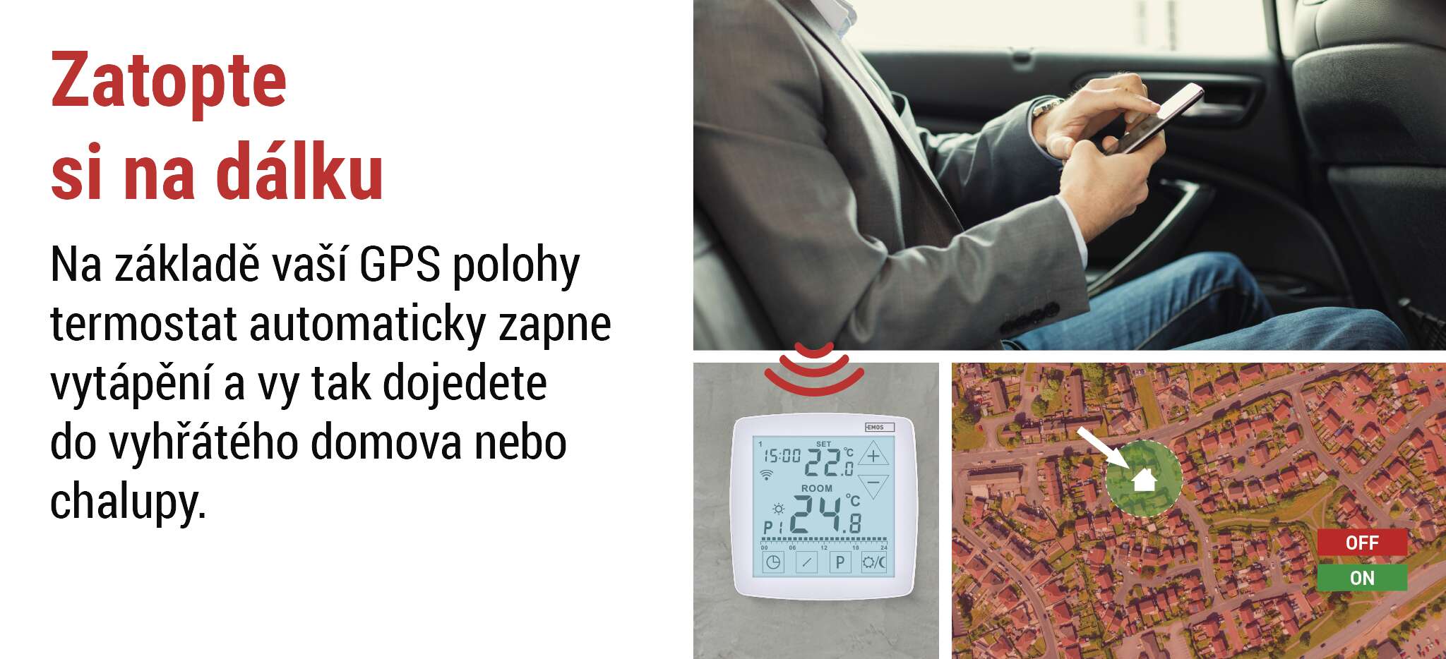 Díky chytré GPS funkci termostat automaticky zapne vytápění nebo chlazení tak, aby vás po návratu vždy přivítala ideální teplota. A pokud odjíždíte na dovolenou a zapomenete snížit topení, žádný problém – přes mobilní aplikaci EMOS GoSmart můžete vše kdykoli upravit na dálku. Pohodlí, úspora a jistota – ať jste kdekoli.