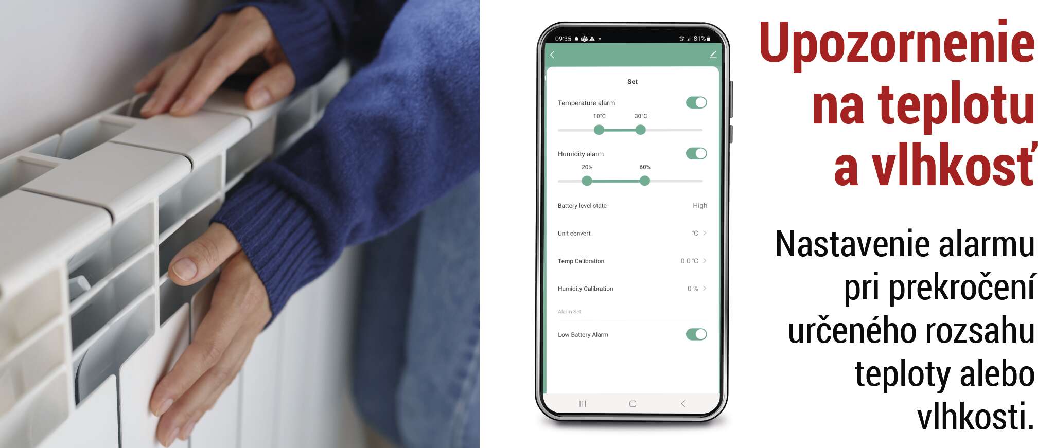 Ak prekročíte zadaný rozsah teploty alebo vlhkosti, dostanete upozornenie na mobilný telefón.