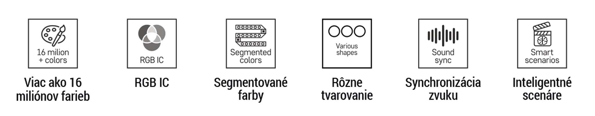 Na zabezpečenie správnej atmosféry je k dispozícii niekoľko prednastavených režimov. Ak vám naše nastavenia nevyhovujú, môžete si v aplikácii vytvoriť vlastný režim, ktorý bude zodpovedať vašej nálade a atmosfére. Inteligentné bodové svetlá sa môžu pochváliť technológiou RGBIC + CCT s viac ako 16 miliónmi farieb a segmentovým ovládaním farieb, kde môžete nastaviť farbu každej jednotlivej časti. Môžete tiež nastaviť jas v rozsahu 10 – 100 %.