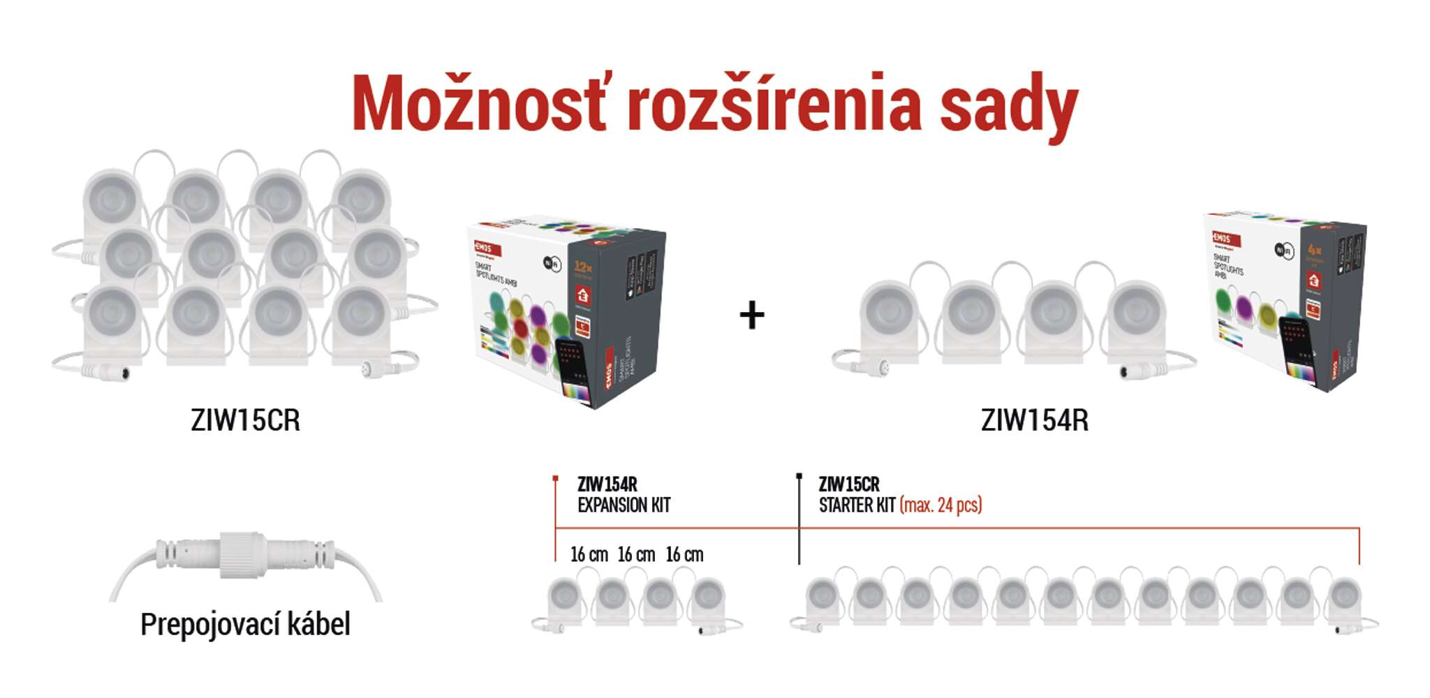 Štartovacia sada (ZIW15CR) obsahuje 12 smart bodových svetiel, s ktorými okamžite navodíte svetelnú atmosféru v každej miestnosti. A pokiaľ potrebujete viac svetla – žiadny problém. Vďaka rozširujúcej sade (ZIW154R) po 4 kusoch môžete celkový počet svetiel navýšiť až na 24. Ideálne riešenie pre osvetlenie celej izby, otvorenej obývačky alebo väčšieho priestoru.