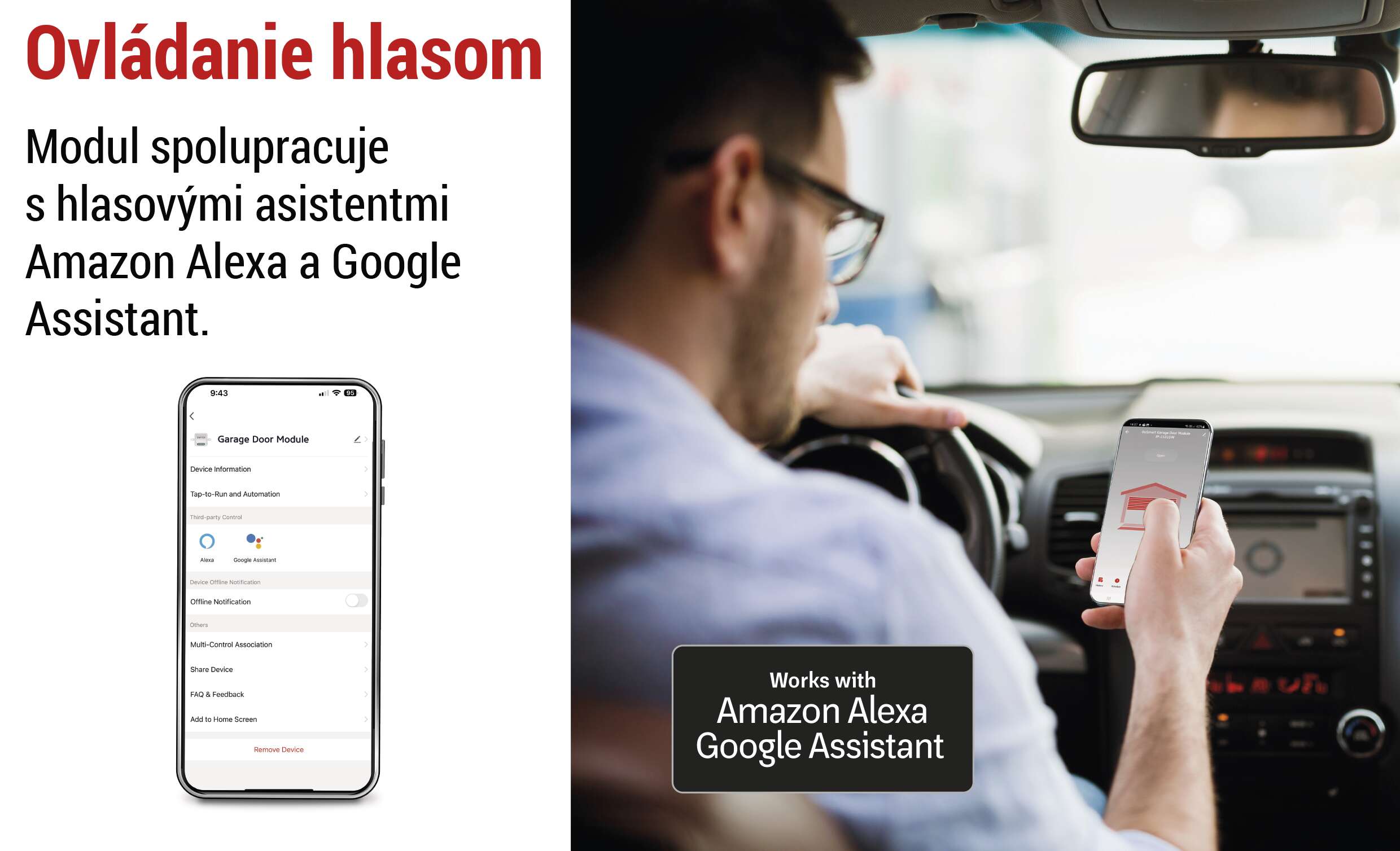 Páči sa vám používanie hlasových príkazov na ovládanie vašich inteligentných zariadení? Vďaka kompatibilite s hlasovými asistentmi stačí jednoduchý hlasový príkaz, ako napríklad „otvor garáž“ alebo „zatvor vstupnú bránu“, aby ste zapli a ovládali svoje zariadenia.