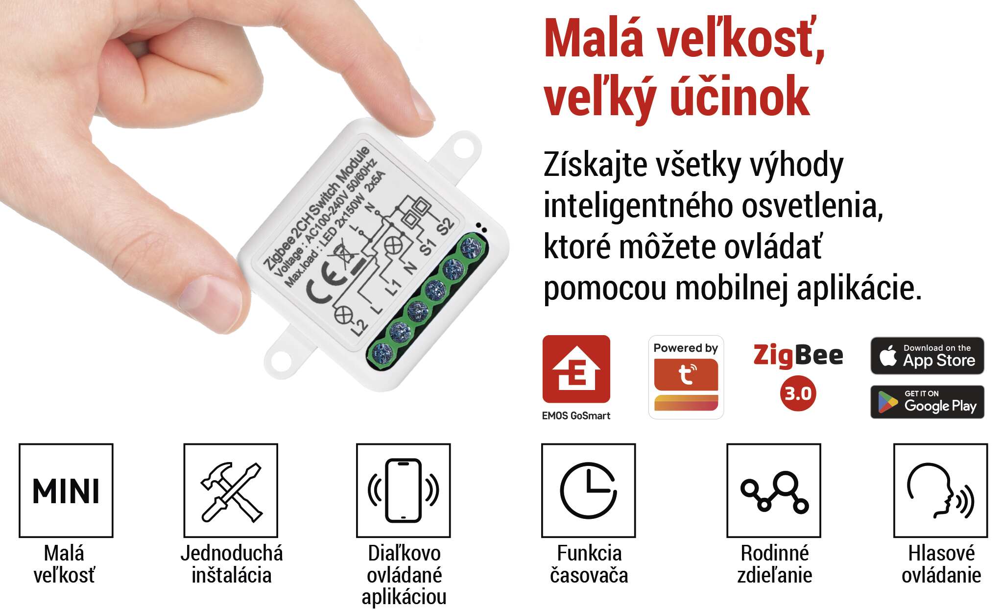- Párovanie a ovládanie modulu pomocou vlastnej aplikácie prostredníctvom brány Zigbee (nie je súčasťou dodávky)