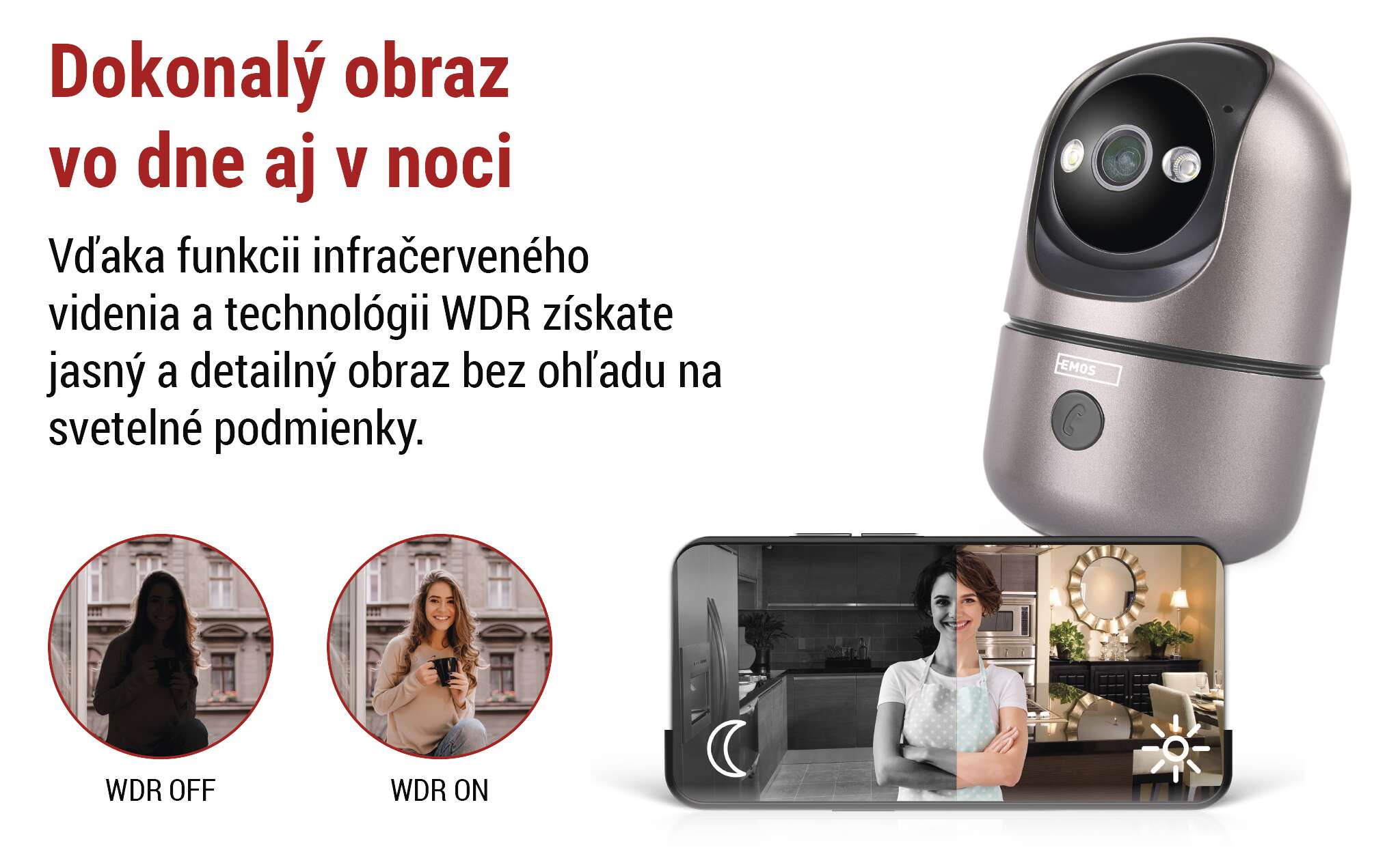 Keďže kamera je vybavená technológiou Wi-Fi s funkciou dual band (2,4 a 5 GHz), stačí ju pripojiť k vašej Wi-Fi sieti a spárovať s mobilnou aplikáciou EMOS GoSmart, ktorá je k dispozícii pre Android a iOS. To vám umožní monitorovať váš domov, kanceláriu alebo obchodné priestory na vašom mobilnom zariadení kedykoľvek a kdekoľvek. Okrem toho je plne kompatibilná s hlasovými asistentmi Google Assistant a Amazon Alexa.