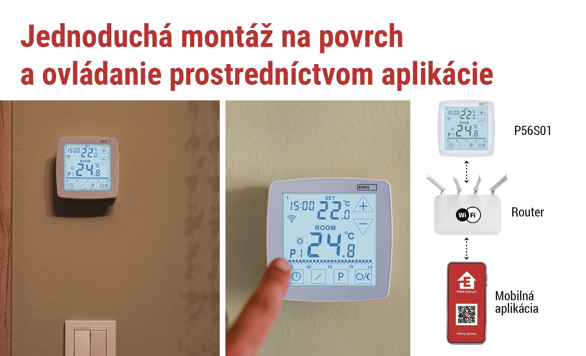 Inteligentný termostat P56S01 je vybavený 3 metre dlhým káblom so snímačom teploty, ktorý vďaka svojej dĺžke môžete pohodlne umiestniť do podlahy k vášmu podlahovému vykurovaniu.Inštalačnú podložku termostatu potom priskrutkujete do vhodnej montážnej krabice, pripojíte vodiče a kábel so snímačom teploty podľa schémy zapojenia a nakoniec pripevníte predný kryt. A máte hotovo! Inteligentný termostat P56S01 sa napája zo siete 230 V AC napájacím zdrojom.