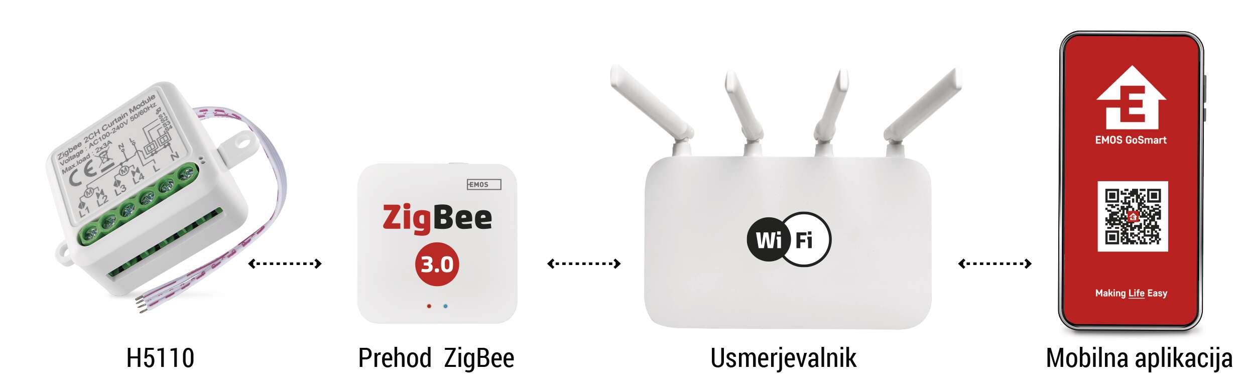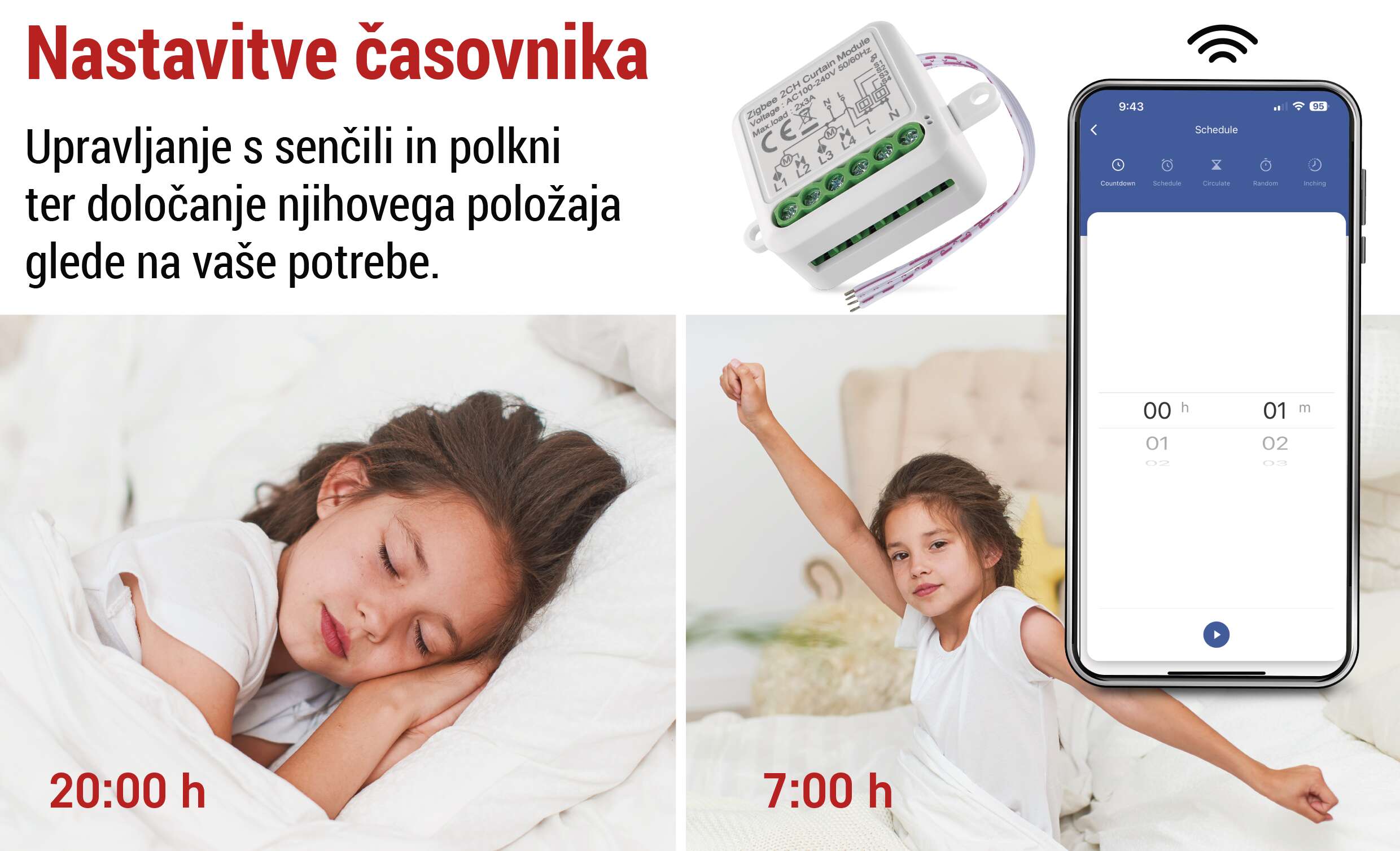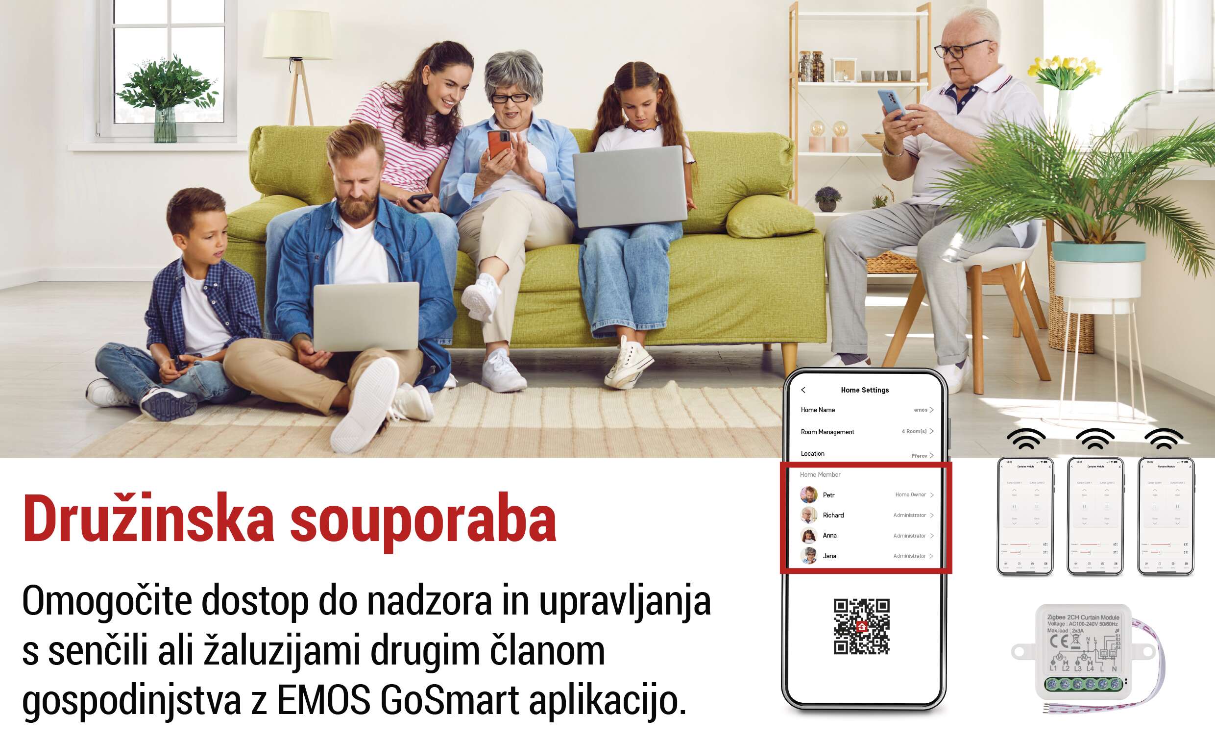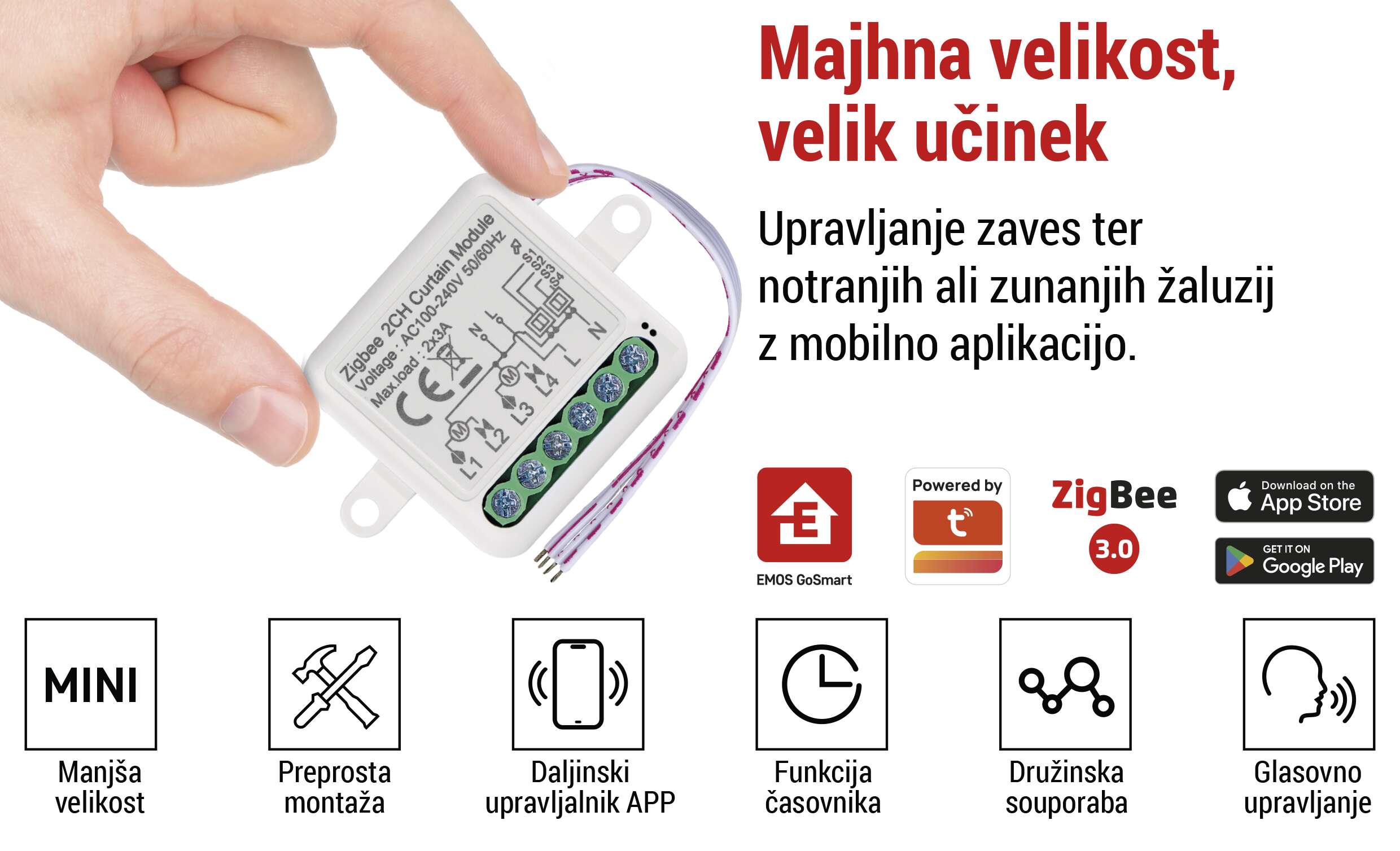 Pametni modul je mogoče povezati z drugimi napravami v vašem domu (ure, luči, senzorji za vrata, okna, ogrevanje). V povezavi z mobilno aplikacijo EMOS GoSmart lahko avtomatizirate, ustvarite scenarije in načrtujete čas za posamezne naprave. Na primer načrtujte čas svojega prebujanja tako, da dvignete žaluzije, ali avtomatsko zatemnite okna ob vnaprej določenem času med vašo odsotnostjo. Ustvarite inteligentni dom, ki se prilagaja vašim potrebam.