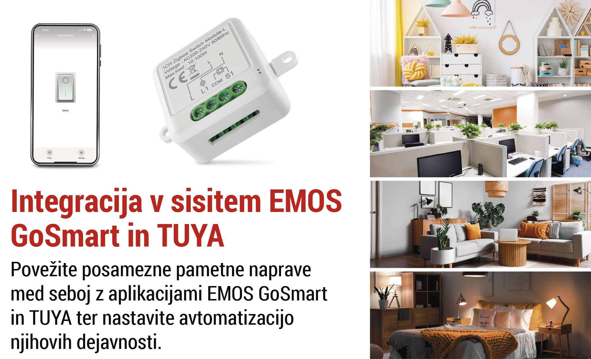 Pametni modul lahko povezujete z drugimi napravami v vašem domu (ure, luči, senzorji vrat, oken, ogrevanja). Po povezavi z mobilno aplikacijo EMOS GoSmart lahko avtomatizirate in načrtujete čas za posamezne naprave. Na primer avtomatsko prižgite luči v času vašega dopusta. Ustvarite inteligentni dom, ki se prilagaja vašim potrebam.